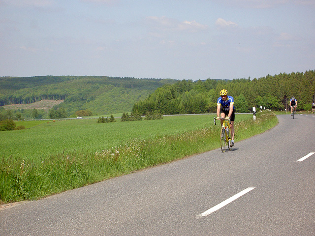 Kurz über die Hochebene bis Consthum, Abfahrt in das Tal der Woltz und gleich wieder hoch nach Alscheid mit bis zu 16% Steigung (2,3 km im Schnitt 5,9%). Vorbei an Koenerhof und dann ging es rasant bergab: in engen Serpentinen stürzte die Straße hinab nach Kautenbach in das Tal der Wiltz. Die Tortour war aber noch nicht ganz zu Ende, kurz über die N25 und wieder links ab in den Berg nach Nocher (3,2 km im Schnitt 5,5%). Von Goesdorf dann zum dritten Mal die Abfahrt in das Tal der Sûre. Jetzt kamen die Erholsamen 3 km entlang der Sauer bis Esch.
