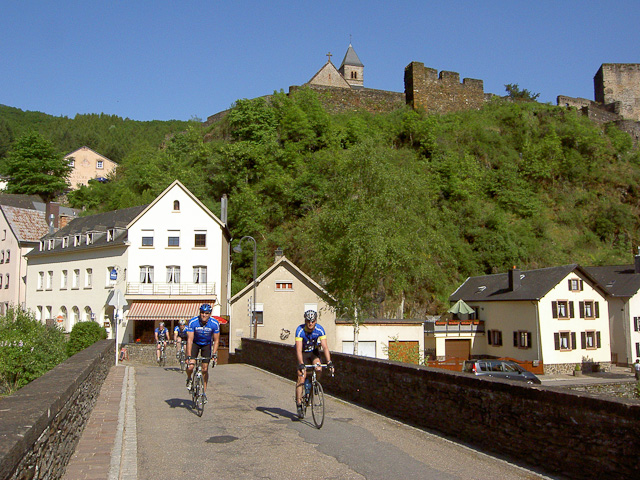 Überwältigend schön, wenn plötzlich hinter einer Straßenbiegung das mittelalterliche Städtchen an der Sauerschleife und von der Burgruine überragt in den Blick gerät. Wir fuhren entlang der Sauer um den Ort herum bis zur Brücke nach Kaundorf. Noch hingen die Augen auf die schönen Stadthäuser und der Burgruine, Blick nach vorne – Schreck in den Beinen. Vor uns eine Wand von Straße, erst sausausteil, dann nur noch sausteil – 2 km im Schnitt 9,2%.