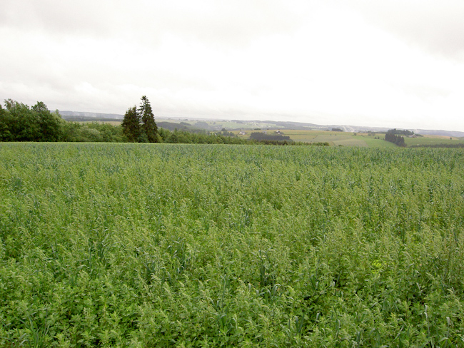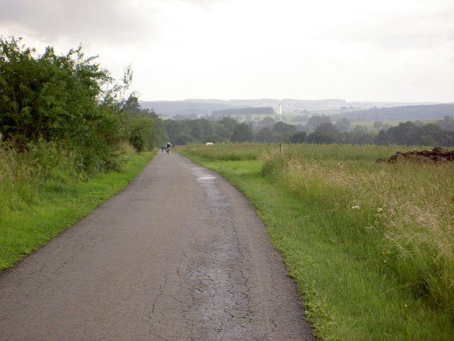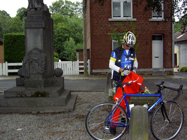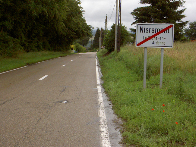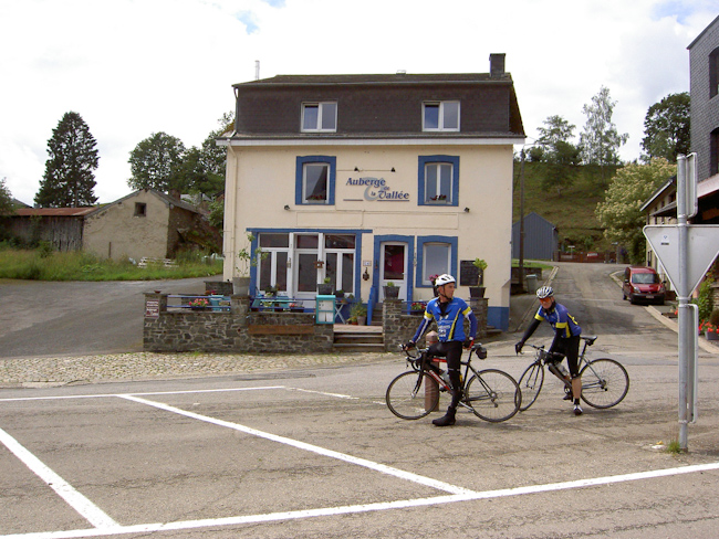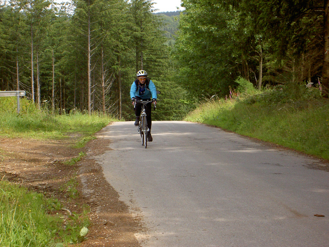 Jetzt war eine der schönsten Radstrecken in den Ardennen angesagt, 20 km durch das Tal der Lienne, immer leicht ansteigend von 190 m auf 365 m üNN, auch im Regen ein Genuss. Als wir das Tal verließen, stand die Überquerung von Baraque de Fraiture an. Das hieß hoch auf über 600 m, und wie es zu dieser Gegend am besten passt, wurden Regen und Wind heftiger, dazu war es auf der Höhe unangenehm kalt. In den folgenden Abfahrten über Wibrin bis in das Tal der Ourthe wurde uns auch nicht mehr wärmer. Mit dem Anstieg aus dem Ourthetal nach Nisramont war dann aber mit der letzten größeren Steigung des Tages wieder Wärme unter die Jacke gefahren. Der Regen gab nach, blaue Himmelsflecken ließen zumindest auf ein gutes Ende hoffen. Im ständigen Auf und Ab führte die Straße uns zur Ourthe Occidence. Der „westlichen Urt“ folgten wir bis zum Campingplatz Tonny in Amberloup. (Tourdaten: 145 km, 1900 Höhenmeter, den ganzen Tag Gegenwind)
