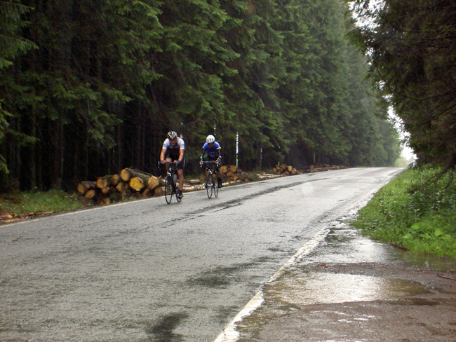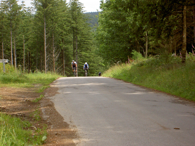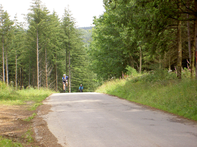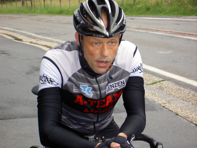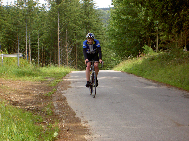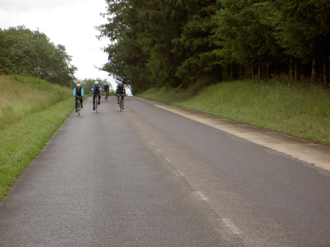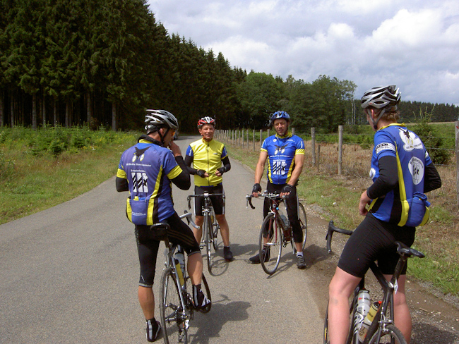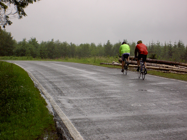 Was, wieder kein Regen! Rückflugtag. Zu fünft machten wir uns mit dem Rad auf den Weg nach Hause. Über die N826 bis nach Houffalize, nicht so schön wie an den Tagen zuvor, aber wieder ständig Achterbahn. Bei Sommerain hatte Albrecht dann die einzige Panne der Tour als er sich in einem Baustellenstück die Decke aufschlitzte. Montleban, Ottre, Vielsalm, mit Tempo das Salmtal hinab bis Coo und über La Rosier nach Spa. Bei Nivezé fing es an zu tröpfeln, in Tiége regnete es wieder, und diesmal war es noch kalt dazu. Solwaster, Jalhay, Gileppe, Wesertal, Eupen, gegen Kälte und Regen hilft Tempo. Wesertalsperre, Raeren, Badewanne. (Tourdaten: 133 km, 1800 Höhenmeter)