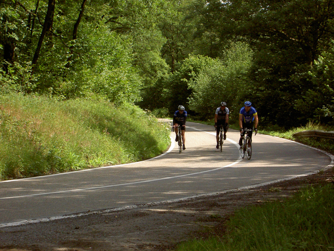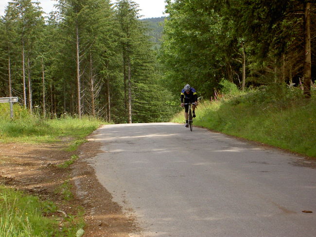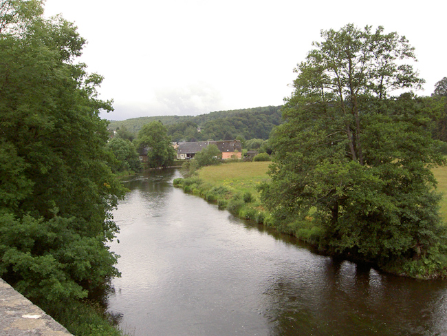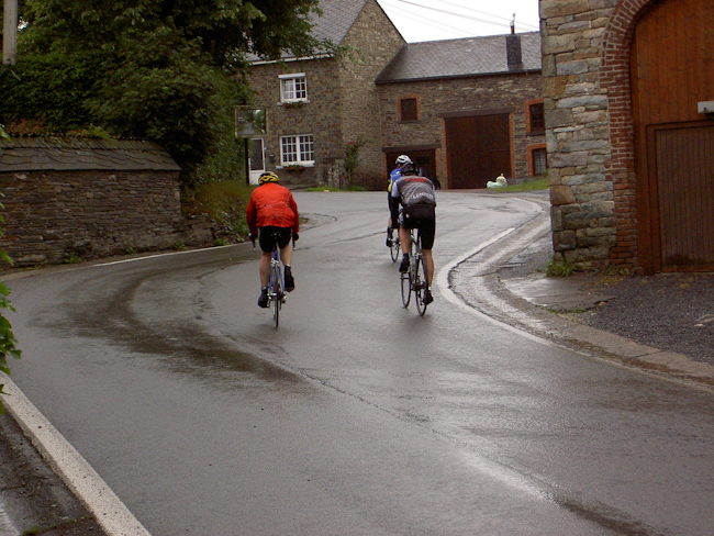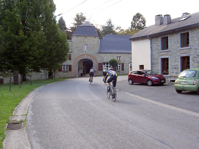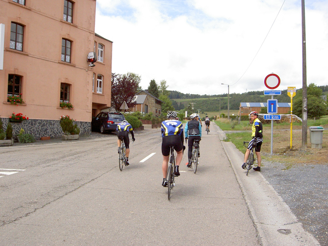 Tillet, Tronquoy, Gribomont um nur ein paar Dörfer zu nennen, es ging hoch, teilweise recht steil, oder runter, kaum ein Stück flache Strecke, die Höhenmeter liefen auf. Nach etwa 42 km dann der Sturz in das Tal der Semois, mit 20 % Gefälle ging es hinab nach Herbeumont. Wer sich jetzt allerdings auf eine Talfahrt freute, wurde enttäuscht. Die Semois ist größtenteils ein naturbelassener Fluss und wird nicht von Straßen begleitet. Also nach kurzer Fahrt bis Mortehan über einen 5 km langen Anstieg aus dem Tal und gleich wieder runter nach Dohan an die Semois. Ein kurzes Stück über eine gesperrte Straße (Erdrutsch), ein kleiner Schwenker über einen geteerten Weg und da war er, der Knüppel des Tages: Cote Les Enclaves, 1000 m lang, Höhenunterschied etwa 130 m, im Schnitt also 13%, max. 18 % Steigung. Danach steile Abfahrt nach Bouillon mit wunderbarem Blick über Stadt und Burg (wer hat den Kopf gehoben?).