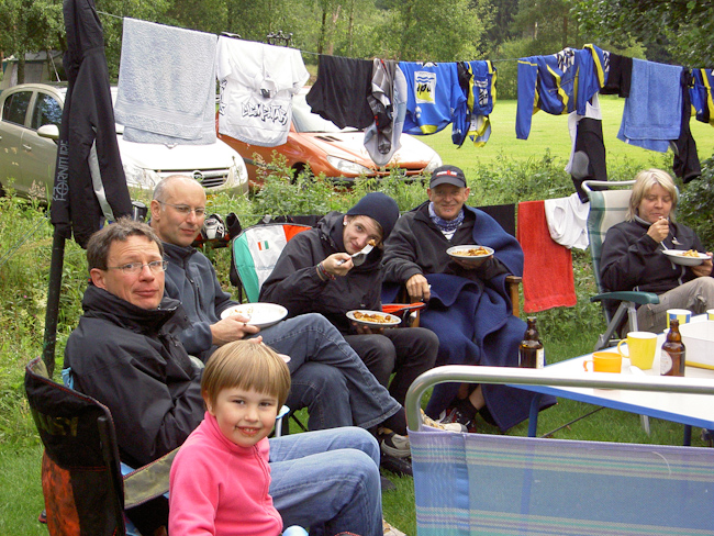 Für den Abend hatten Simone und Rob vom Camping Tonny zum Rippchen-Essen geladen. Die Portionen waren radfahrergerecht, der Rest wurde mit belgischen Spezialitäten erledigt (Cuvée de la Jonquille, Jupiler). Der Abend klang an einem großen Lagerfeuer aus. (Wer hat es noch entzündet? Michel, Jürgen?).