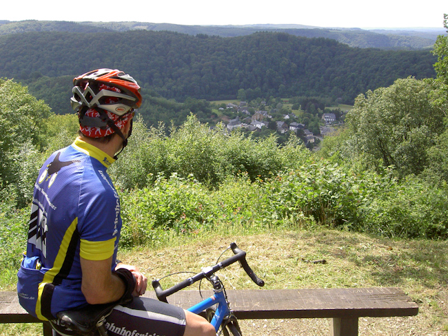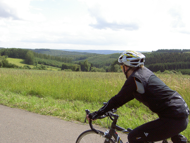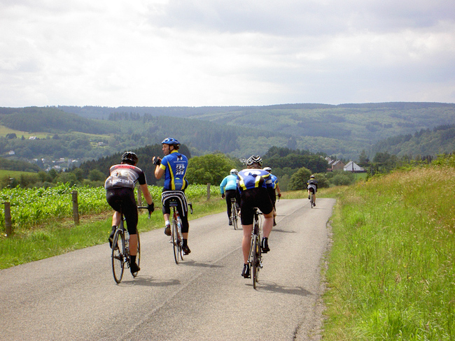 Nach einem Kaffee und einer Tarte Au Riz ging es über einen 6 km langen gemäßigten Anstieg wieder auf die Höhe und – na klar – gleich wieder im Krähensturzflug hinab an die Semois nach Poupehan und – genau so klar – wieder über 7 km 230 m höher. Nach einem letzten Blick über das wunderschöne Tal der Semois führte die Strecke wieder über die Höhen, flach wurde es aber nicht. Abwechselnd bergauf oder bergab, teils steil, teils richtig lang oder beides. Nach 123 km wurde hinter Vesqueville mit 539 m üNN der höchste Punkt der Runde erreicht. Von dort ging es aber dann tatsächlich die letzten 10 km bis Amberloup nur noch bergab. (Tourdaten: 133 km, 2100 Höhenmeter)