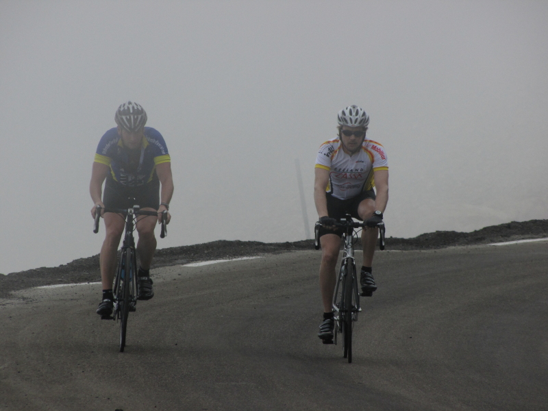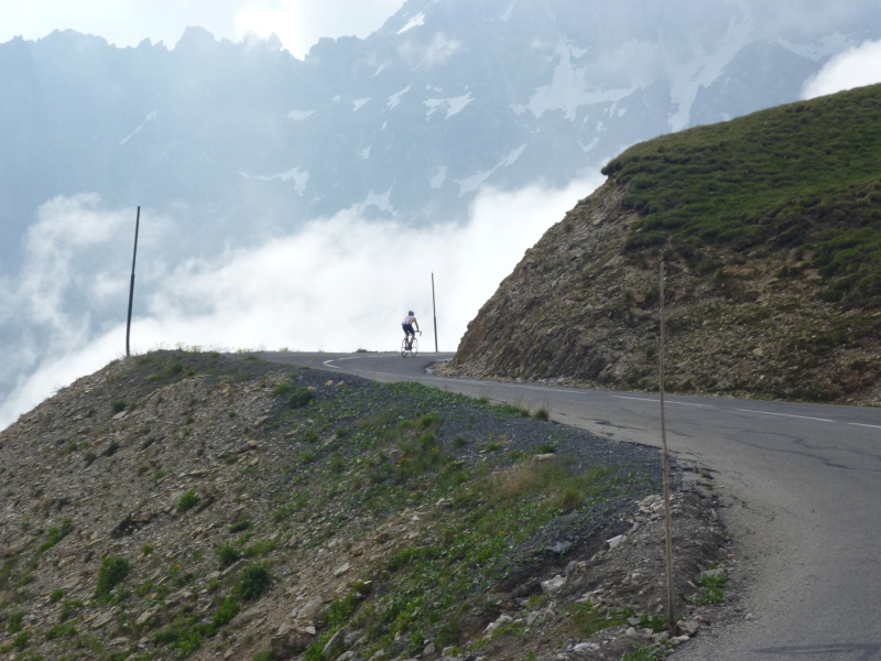 Und meine persönliche Auffahrt auf den Galibier war von üblem Sodbrennen überschattet. Vielleicht eine Folge des ‘Genusses’ dieser ganzen Iso-Plörre. Wie zur Bestätigung meines Zustands hüllte sich die Passhöhe des Galibier in eine dichte Wolke, die jede Aussicht verhinderte und die Temperaturen in den einstelligen Bereich drückte. Also Jacke überziehen, abfahren, Tee trinken, Wärme tanken, Schafherde durchqueren (ok, das war am Tag danach) und weiter auf den Col du Telegraphe. Der im übrigen von ein paar Hundert Fremdenlegionären für ein kleines Manöver genutzt wurde. Irgendwie bizarr: Rennradfahrer, bunt gekleidet, fährt in großer Hitze den Pass hinauf, langsam vorbei an gut getarntem Soldaten mit Gewehr im Anschlag: „Bonjour!“ – „Bonjour!“
