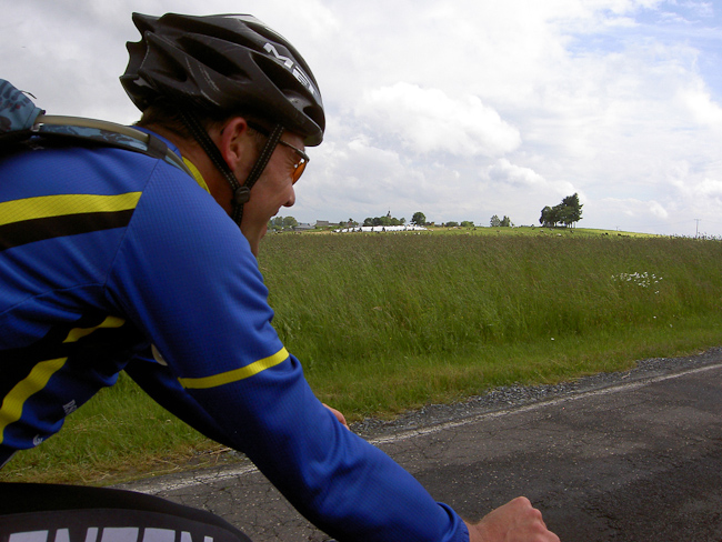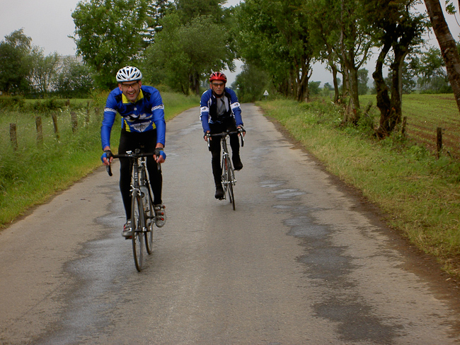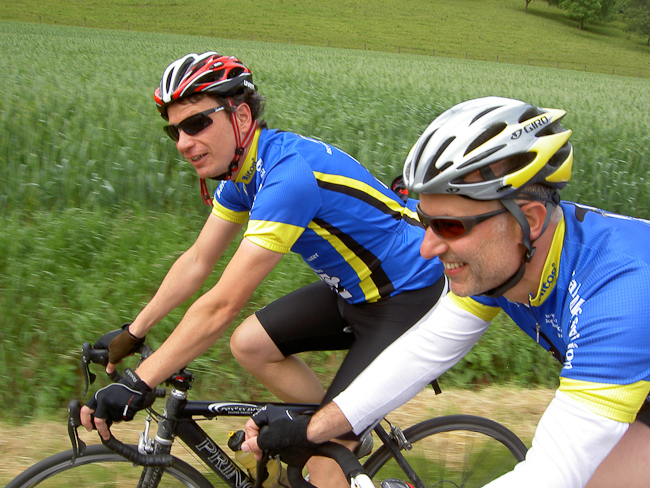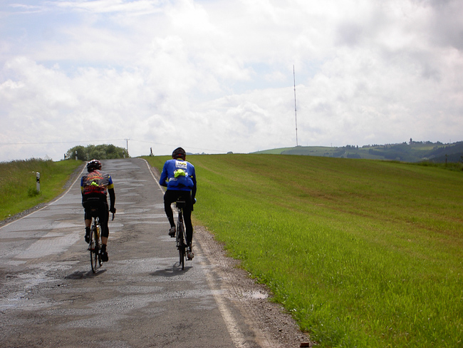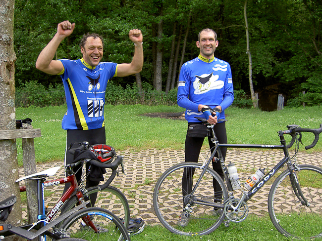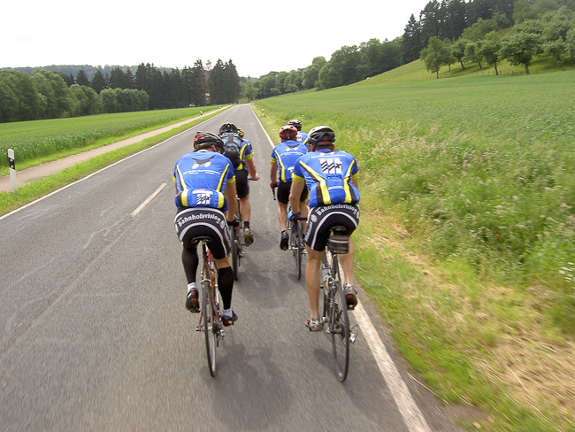 Nach reichhaltigem und ausgedehntem Frühstück waren alle bereit zum Start. Die Sonne schien, kurze Hose, kurzes Trikot, wohlfühl. Von Obersgegen 10 km Abfahrt in das Sauertal, ein guter Start für müde Beine. Weiter durch das Sauertal: Dillingen, Bollendorf, Weilersbach. Hier scharf links und mit der Auffahrt nach Ferschweiler stand die erste Prüfung des Tages an. Ketten rasselten über die Ritzel, ein Knacken und Michels Schaltwerk hing nur noch am Zugseil. Reparaturversuche waren sinnlos, Michels Krähenflug war leider beendet.
