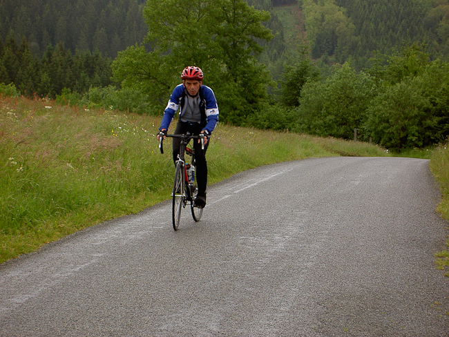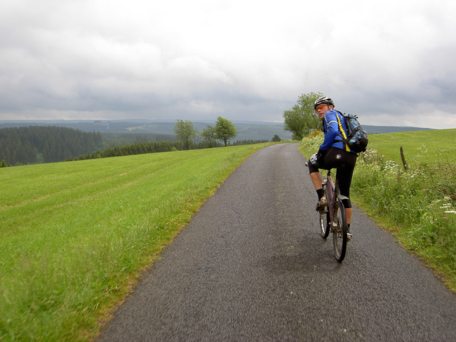 Die übrigen 6 Fahrer schwangen sich auf die Höhe bei Ferschweiler und wieder hinab in das Prümtal. Entlang der Prüm zurück zur Sauer und bei Steinheim rüber nach Luxemburg. Weiter im Tal – Rosport, Hinkel – jetzt aber rechts ab aus dem Tal heraus. Der längste Anstieg des Tages über 6 km bis Dickweiler führte auf die Hochebene zwischen Sauer, Mosel und Alzette. Boursdorf, Berbourg, Olingen, Gonderange. In ständigem Auf und Ab ging es von Ort zu Ort, durch Wiesen und Wälder, mit schönen Aussichten. Die kurzen Steigungen auf den kleinen verkehrsarmen Landstraßen und befestigten Nebenwegen waren teils recht steil und auf Dauer anstrengend.
