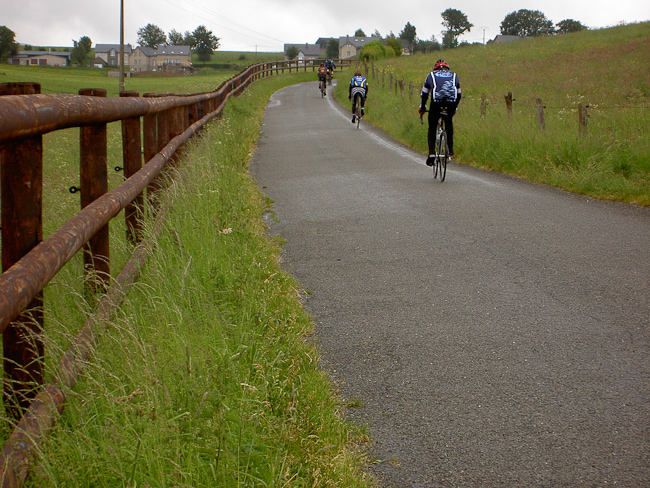 Die neuen Teilstücke des Vennbahnweges nutzend ging es nach Schmithof, Raeren, Petergensfeld, Fringshaus, Konzen. Hier war der Teer am Vennbahnweg noch so heiß das wir auf der Straße weiter mussten. Ins Leyloch und wieder Vennbahnweg nach Küchelscheid. Stürmischer Gegenwind, immer wieder Regenschauer, gute Stimmung im Peloton sieht anders aus, und jetzt noch auf der Rurstraße nach Camp Elsenborn. Nachdem die ersten 20 km fast nur bergauf gingen, wurden jetzt der Regen und die niedrige Temperatur zunehmend unangenehmer. Weywertz, Schoppen, über kleine Nebenstrecken durch die Felder, die Regenpausen wurden länger, Hoffnung auf eine noch schön werdende Radtour keimten auf. Schoppen, Möderscheid, tolle Fernsicht von den Höhen, Ambleve, der Himmel reißt auf, über das Hochplateau und in rasender Abfahrt nach Schönberg. Das Ourtal war erreicht.