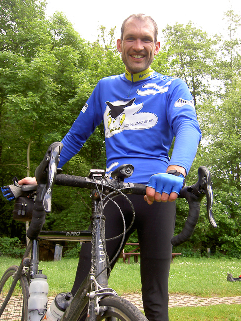 Tatsächlich waren 5 Fahrer am Start, Lars saß ja noch am Regenradar und Albrecht schaute nur kurz vorbei, der Arme-Glückliche konnte noch nicht mitfahren und übernahm am Nachmittag den Gepäcktransport. Kurz nach 10 ließ der Regen nach, Lars tauchte aus dem Dunst auf und es konnte los gehen.