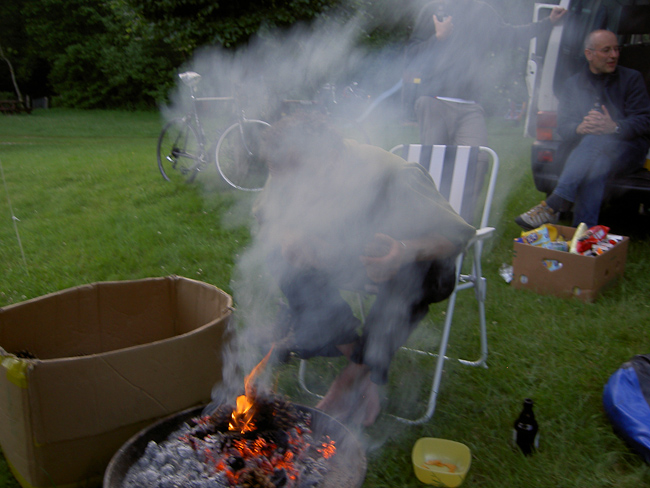 Der kleine Campingplatz liegt sehr schön direkt am Gaybach, total ruhig zu dieser Zeit. Albrecht war auch schon da und nachdem alles aufgebaut war, wurde das leckere Paprikagulasch mit Nudeln von der Bahnhofsvision verputzt und die Flüssigkeitsspeicher für den folgenden Tag gefüllt. Für abendliche Wärme sorgte dann Zapfenbrandmeister Joi mit seinem Zapfenfeuer. Die sportliche Männerrunde hatte den idealen Platz gefunden, direkt am plätschernden Gay-Bach.