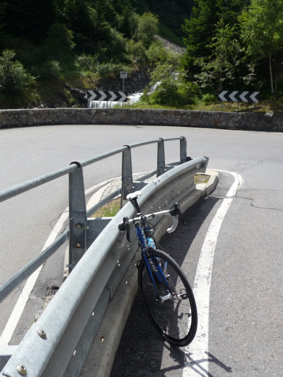Am nächsten Tag [3] konnten der einsame Umbrailpass bergauf genossen werden – leider dauerte diese Auffahrt lediglich eine kurze Stunde. Die Abfahrt Richtung Bormio(I) war ungleich belebter – hier tummelten sich jede Menge Radfahrer, Langläufer, Camper, Mopets und Autos – ein wahrer Rummel – später erfuhren wir, warum: es war Ferragosto, Italiens bedeutendster Feiertag aus heidnischer Zeit. Nach einer kleinen Ziehstrecke durch das Valtellina ging es vorbei an Apfelplantagen (auch wurde der Mortirolo links liegen gelassen) nach Tirano und über den Forcolapass nach Livigno (I). Ein bekanntes Phänomen auf der ein oder anderen Krähetour ist, dass mit viel Improvisationstalent, Geduld und Verständnis das ein oder andere Rad kurzfristig fitgemacht werden muss – das bei diesen Gelegenheiten gesammelte Fachwissen kam auf dieser Etappe einer vorzeigbaren Rennraddame zugute, die die Gefahren, welche von Strassenbahnschienen (hier im speziellen der Berninabahn) ausgehen können etwas unterschätzt hatte.