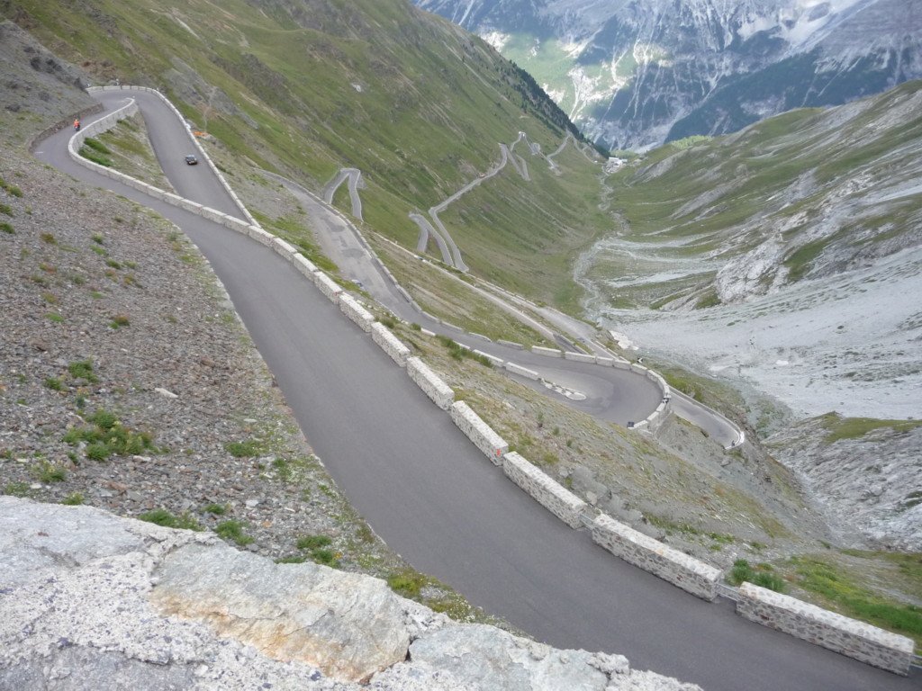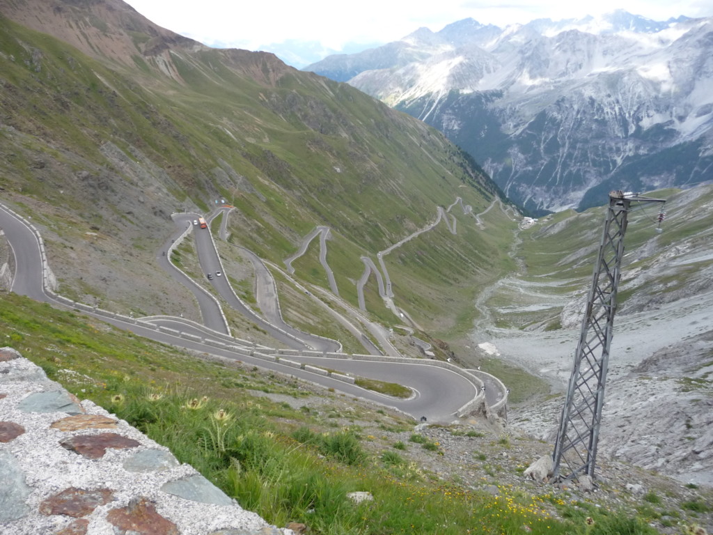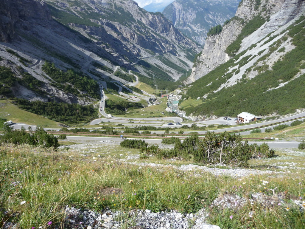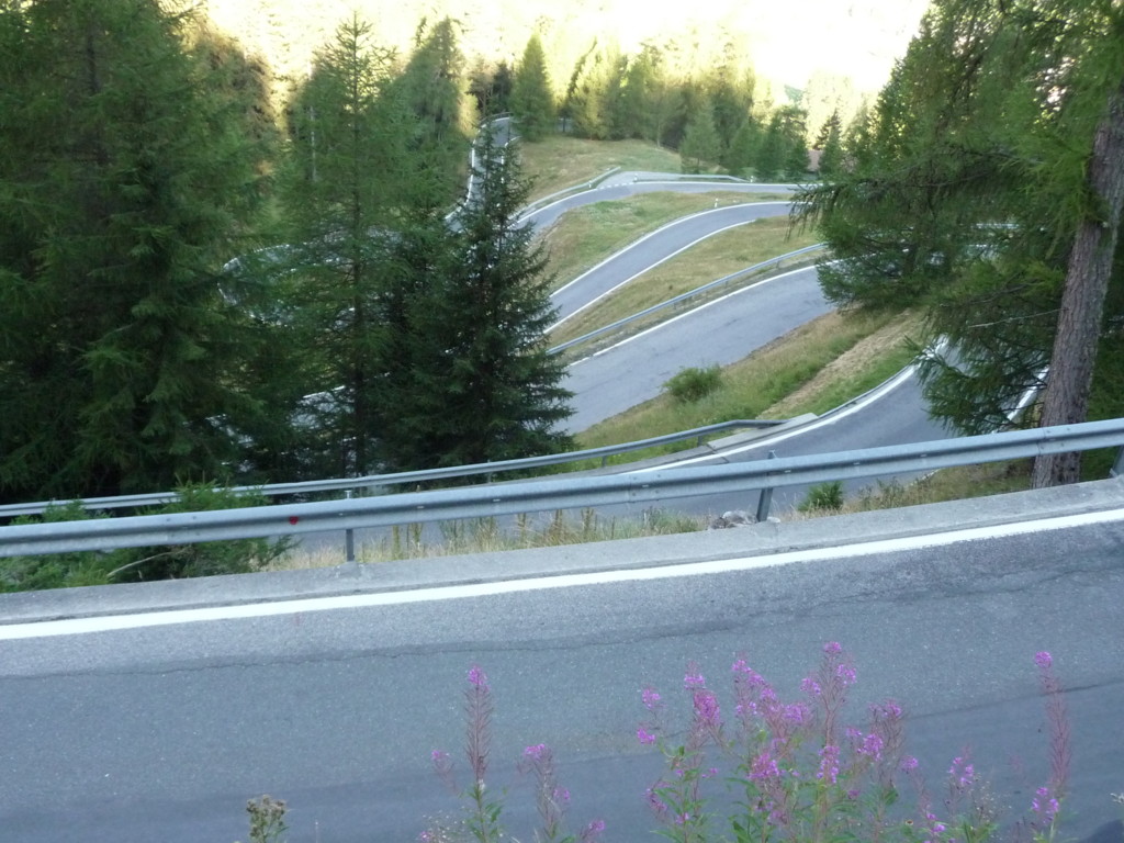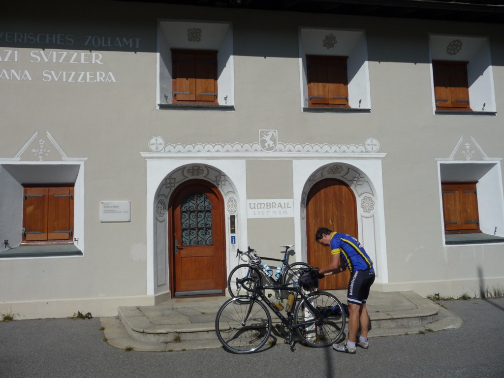 Das Hotel in Nauders machte eine Weiterfahrt fast unmöglich. Die Räder waren in einem Keller mit Nummernschloss gesichert – wie sich nun herausstellte besser als die US-Atomraketen (00000000), wem das nicht reichte, der konnte sich noch ein 5kg schweres Kettenschloss ausleihen. Die Fahrradschuhe wurden in ein blinkendes verchromtes Schuhregal gestellt – im Austausch bekam man bequeme Wellnesspantoffeln und als Welcome leckere Erdbeersahnetorte. Alle Versuche von Lutz am nächsten Tag einfach um den Block zu fahren und erneut einzuchecken wurden von Albrecht erfolgreich vereitelt – und so stand unumgänglich die zweite C-Runde [2] nach Sta.Maria an. Nach unserer einzigen Panne aufgrund eines defekten Felgenbandes musste Lutz seine überschüssigen Kuchenkalorien auf einer Abkürzung nach Sulden abarbeiten während Albrecht auf der Franzenshöhe den Kaffee bestellte. Die letzten Höhenmeter des Tages über das Stilfser Joch wurden gemeistert, danach erfolgte schon die Abfahrt über den schönen Umbrailpass in das ruhige Sta. Maria (CH).