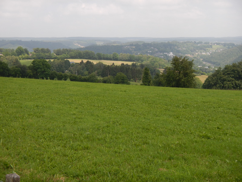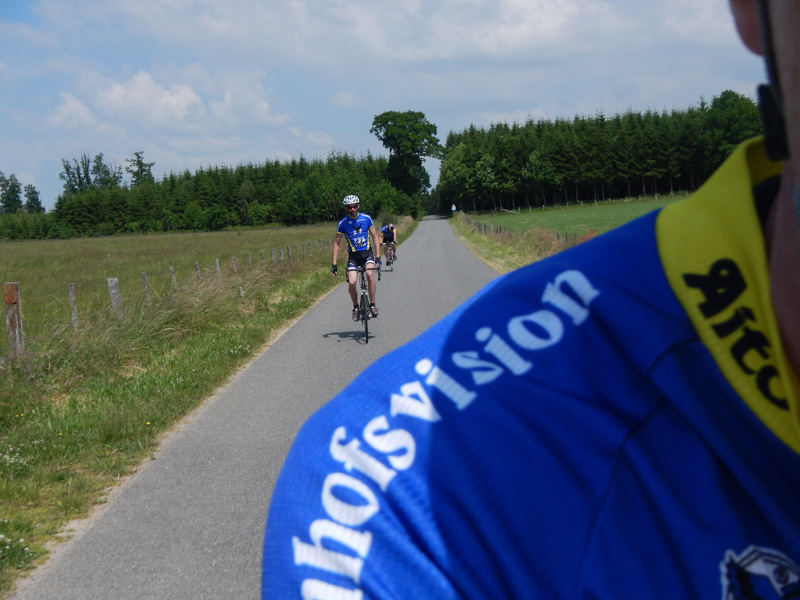 Hinter Sourbrodt wurde der Vennbahnweg wieder verlassen und über kleine belgische Nebenstraßen durch das Tal der Warche nach Champagne und Waimes gefahren. Ab hier befuhren wir einen der schönsten Abschnitte des RAVEL Radweges bis nach Malmedy. Die ersten 58 km waren absolviert und die Beine locker gefahren. Was jetzt auch nötig war, denn vor uns stand die Wand der Route de Floriheid. Recht humorlos geht es hier hoch mit bis zu 21 % Steigung. Von der Höhe eröffneten sich wieder diese weiten Ausblicke über die Ardennentäler. Im weiteren Verlauf wurde die Straße gerade frisch geteert. Die Straßenbauer machten uns auf die noch hohen Temperaturen in der neuen Teerdecke aufmerksam und meinten, es wäre besser, das Rad zu tragen. Tragend und schiebend passierten wir den 60 °C heißen Straßenabschnitt.