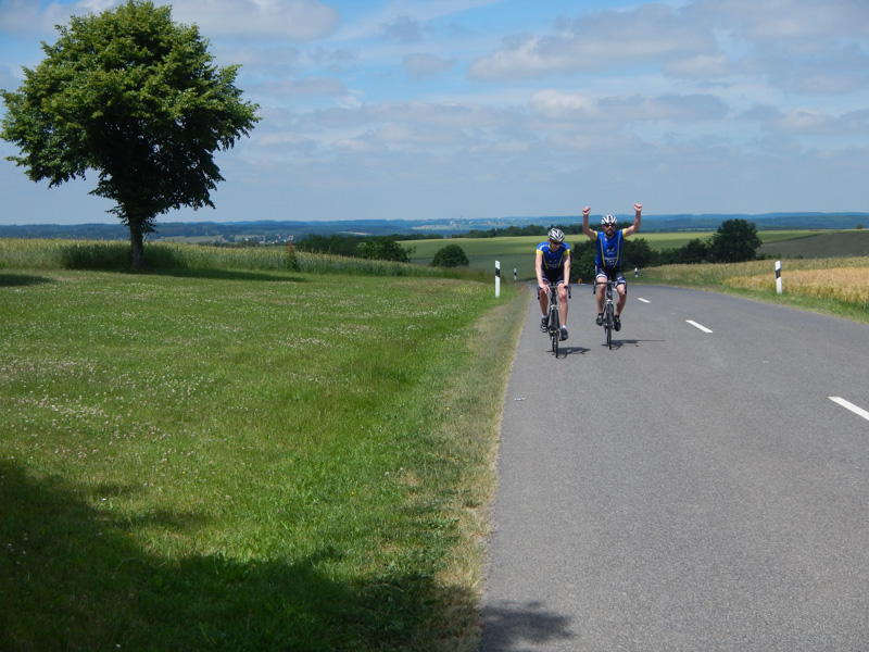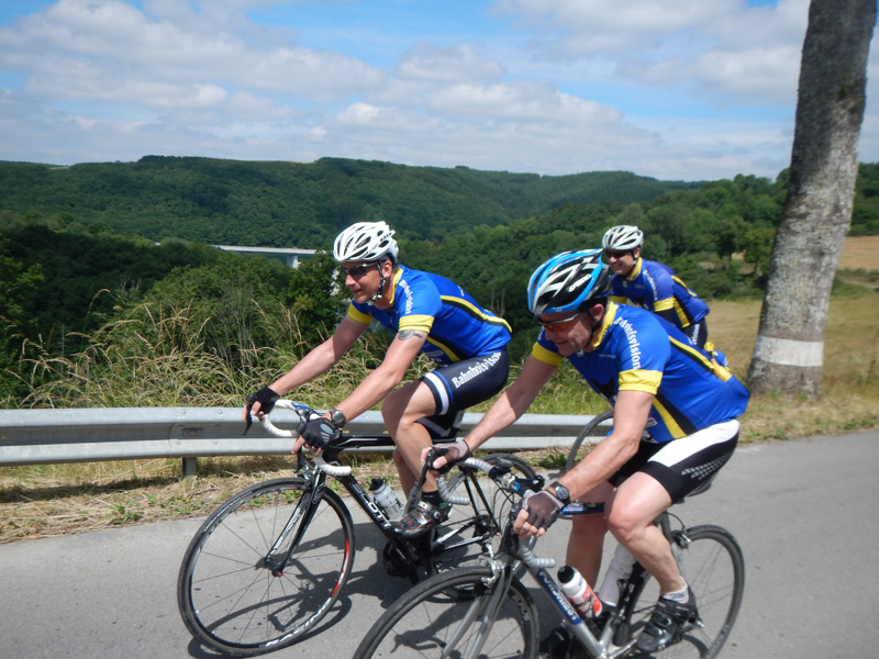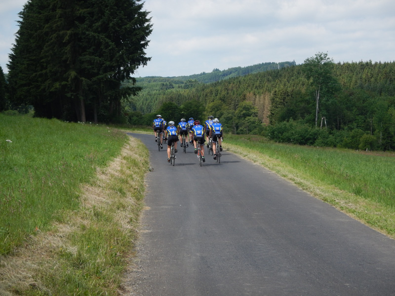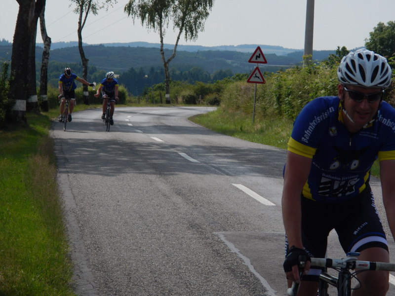 Durch einen kleinen Wald ging es über Serpentinen hinab nach Buderschei, weiter über einen lang gezogenen Anstieg nach Kaundorf oder wie am Ortseingang auf dem Schild stand: Route Barrée. Nach Überfahren der nächsten Höhe verführte die breite gut ausgebaute Straße mit langem 12 % Gefälle zu Höchstgeschwindigkeiten weit über 70 Stundenkilometer. Über den Staudamm der Barrage d‘ Esch-sur-Sûre und weiter am in der Sonne glänzenden See entlang bis Lultzhausen. Hinter Lultzhausen war Streckentrennung. Ein Teil der Gruppe fuhr eine verkürzte Runde die über die CR314 hoch nach Eschdorf und bei Heiderscheid wieder auf die Strecke der großen Runde traf.