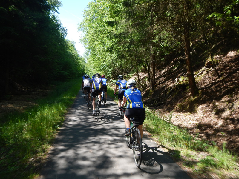 Der erste richtige Anstieg des Tages führte über einen kleinen Weg durch den Wald aus dem Wiltztal hoch zur Duerfstrooss in Selscheid, es ging weiter nach Boxhorn und hinab an den Trätterbaach. Über einen kleinen giftigen Anstieg ging es hinüber in das Woltztal und nach Troisvierges. Der Ort war aus logistischen Gründen in die Strecke geraten, lagen doch ausschließlich kleine Dörfer ohne Bäckereien und Geschäfte an der Strecke. Nach rund 60 km musste also zur Vermeidung von Unterzuckerung und dadurch zu erwartende Einbrüche bei Stimmung und Leistung ein Pausenort vorgesehen werden. Hiermit war der lockere Teil der Runde dann aber auch abgeschlossen, irgendwo mussten ja die 2.200 Höhenmeter noch eingefahren werden.
