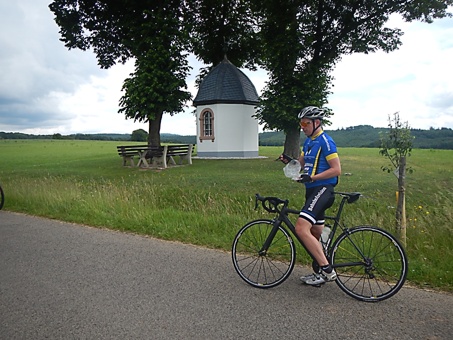 Nach der Kaffee&Kuchen-Aufnahme stand ein etwas längerer Anstieg auf über 500 m Höhe auf dem Programm, weiter vorbei an Effelsberg und runter in das Ahrtal. Brück, Ahrbrück, die lange Anfahrt auf die Hohe Acht, dem höchsten Hügel -746,9 m- in der Eifel. Die ersten Kilometer mit mäßiger Steigung, erst zum Ende hin wurde es mit bis zu 12% steiler. Bergab nach Siebenbach und Acht, die letzten 30 km im ständigen Auf und Ab bis Ulmen.