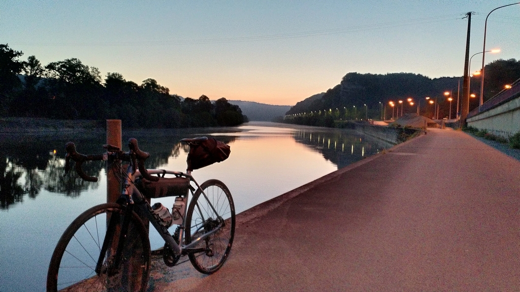 Über die stockdunkle Vennbahn kurbelte ich nach Belgien, die Beleuchtung streifte immer mal wieder Tiere am Rand, es raschelte im Wald, irgendwie doch unheimlich. Über Eupen und Battice gelangte ich nach Lüttich. Eine echt schräge Erfahrung, nachts um Zwei durchs total ruhige, leergefegte Lüttich zu radeln, dabei die Ourthe mit der Maas zu verwechseln und eine kleine Extrarunde zu drehen. Die Ruhe der Innenstadt wich dann im Südwesten von Lüttich dem Dauerlärm riesiger Industriebetriebe – welch ein Kontrast. Langsam die Großstadt hinter mir lassend ging es weiter die Maas entlang. Vorbei an Tihange, Huy, Namur, inzwischen dämmerte es. Den Maasradweg mied ich hier in Belgien, immer wieder schlug das Ding wilde Haken oder es gab Abschnitte von Schotter oder gröbstem Kopfsteinpflaster. Stattdessen blieb ich hier vorwiegend auf der Straße, die ja in Belgien vorbildlich beleuchtet ist. Wäre doch schade, das nicht zu nutzen!